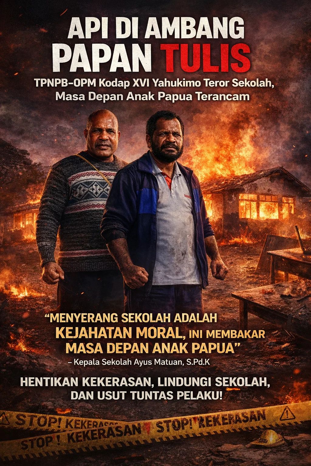 Pagi harinya, para guru yang datang untuk mengajar mendapati sekolah hampir menjadi abu. Tangis tertahan dan amarah bercampur menjadi satu. “Ini bukan sekadar membakar gedung, ini membakar masa depan,” ujar Kepala Sekolah Ayus Matuan, S.PdK, dengan suara bergetar. Ia menegaskan, menyerang sekolah adalah kejahatan moral yang merampas hak anak-anak Yahukimo atas pendidikan, harapan, dan kehidupan yang lebih baik.