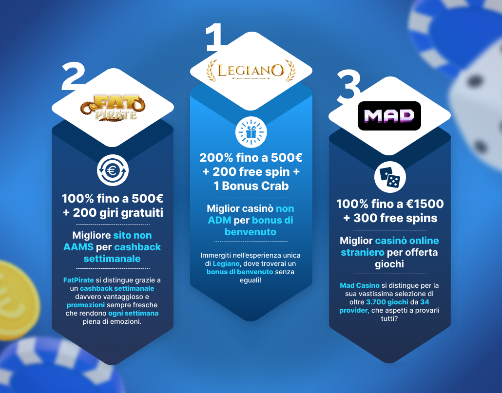 L’amore degli italiani per i videogiochi è profondo e i casinò online portano questa emozione direttamente sul tuo schermo. Tuttavia, con così tante opzioni, trovare un sito web sicuro e di alta qualità non è facile. Ecco perché abbiamo selezionato con cura i migliori casinò online in Italia per il 2025, che offrono bonus di prima qualità, pagamenti rapidi in euro e un’esperienza di gioco senza pari.