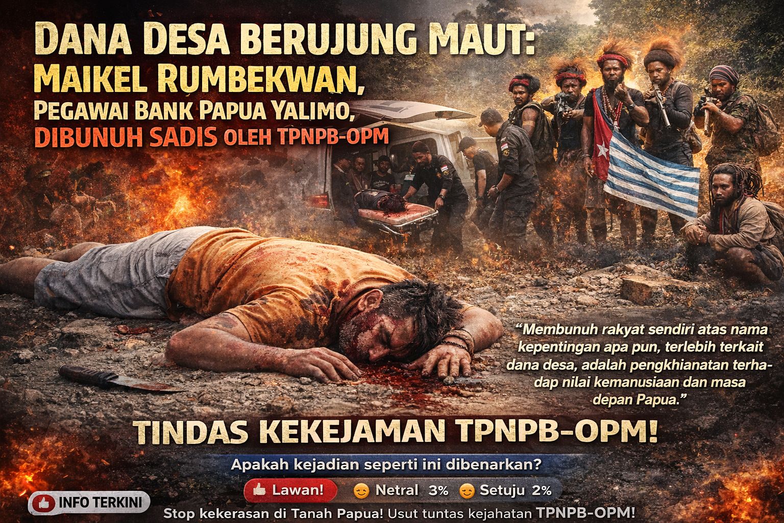 Peristiwa ini menjadi pengingat bahwa Papua hanya bisa maju melalui kedamaian, pembangunan, dan perlindungan terhadap warga sipil. Dana desa seharusnya menjadi sumber kesejahteraan, bukan alasan untuk menebar teror.