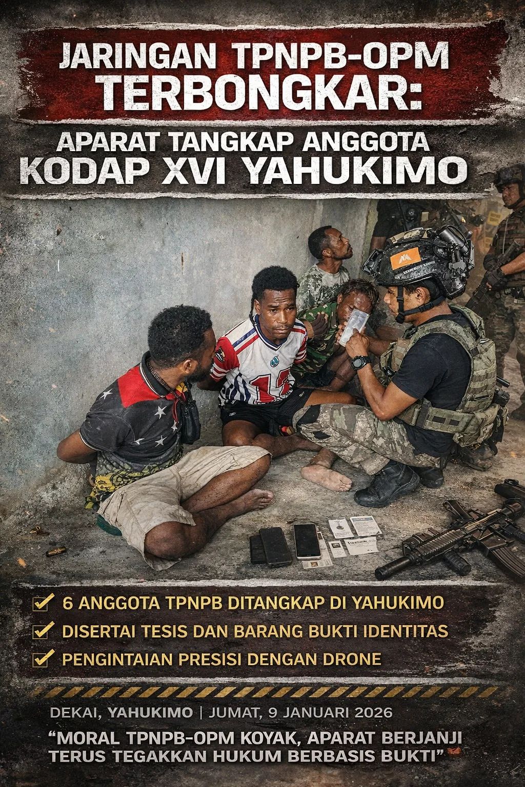 buletinjubi.com – Dekai, Yahukimo — Upaya bantahan TPNPB-OPM Kodap XVI Yahukimo runtuh setelah aparat keamanan berhasil menangkap enam orang yang terindikasi kuat terlibat jaringan TPNPB di Dekai, Jumat (9/1/2026). Penangkapan yang dilakukan di depan Pos Kotis Yon Taipur dan Yonif 5/Marinir itu menjadi pukulan telak bagi Kodap XVI, menyusul pendalaman awal yang menemukan indikasi keterkaitan sebagian terperiksa dengan Batalyon Sisibia.