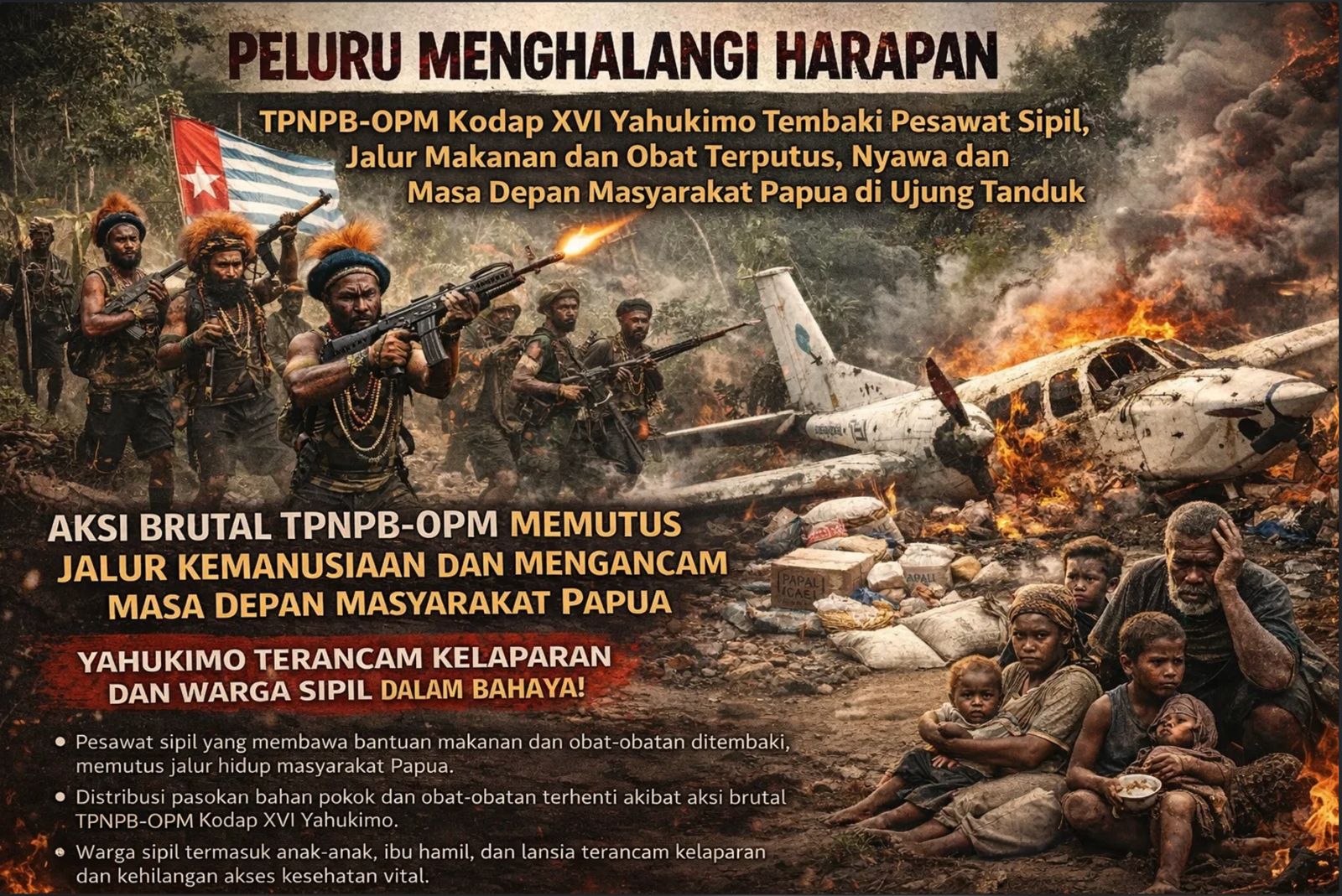 buletinjubi.com – Dekai, Yahukimo — Aksi penembakan terhadap pesawat sipil yang membawa bahan makanan dan obat-obatan bagi masyarakat Yahukimo menjadi bukti nyata bahwa TPNPB-OPM Kodap XVI tidak menginginkan kemajuan, keselamatan, dan kesehatan rakyat Papua. Tindakan brutal ini bukan hanya membahayakan nyawa awak dan penumpang pesawat, tetapi juga memutus jalur kehidupan masyarakat yang bergantung pada pasokan bahan pokok, obat-obatan, dan kebutuhan penting lainnya.