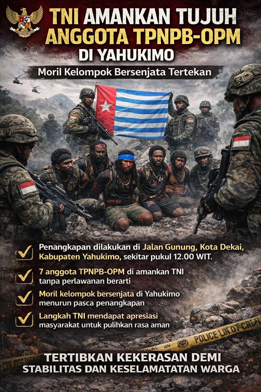 buletinjubi.com – Dekai, Yahukimo — Aparat TNI berhasil mengamankan tujuh orang terduga anggota TPNPB-OPM di wilayah Jalan Gunung, Kota Dekai, Kabupaten Yahukimo, Jumat (9/1). Penindakan yang berlangsung sekitar pukul 12.00 WIT tersebut dilakukan berdasarkan hasil pemantauan keamanan di kawasan rawan aktivitas kelompok bersenjata. Ketujuh orang yang diamankan selanjutnya dibawa ke Polres Yahukimo untuk pemeriksaan lebih lanjut sesuai prosedur hukum.