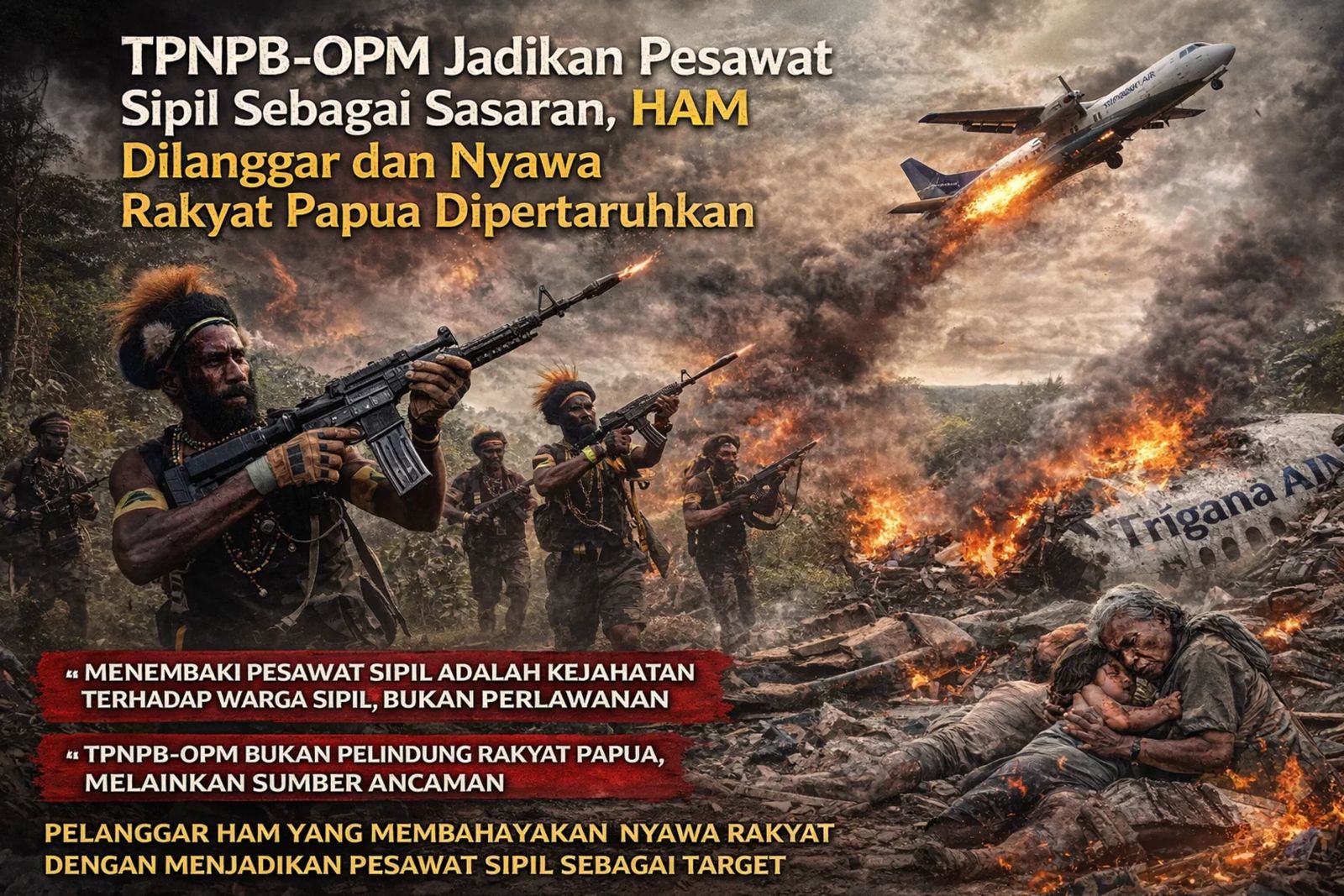 Dengan menjadikan pesawat sipil sebagai sasaran, TPNPB-OPM menunjukkan ketidakpedulian total terhadap prinsip kemanusiaan dan hukum humaniter internasional. Pesawat Trigana adalah jalur hidup rakyat Papua yang mengantar pasien, bahan pangan, dan mobilitas warga. Menembakinya berarti menyerang hak hidup dan rasa aman rakyat Papua sendiri.
